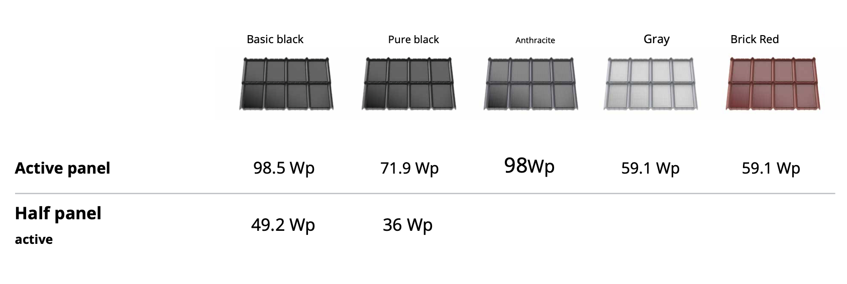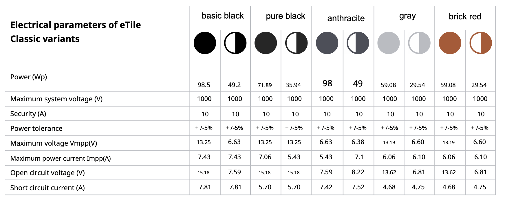 Tile Classic is available in 5 standard color options, which differ in both the glass color and the metal sheet. Due to the technology, the variants also differ in the power generated, which is lower for colored glass with reduced translucency. Detailed electrical parameters are provided in the tables.